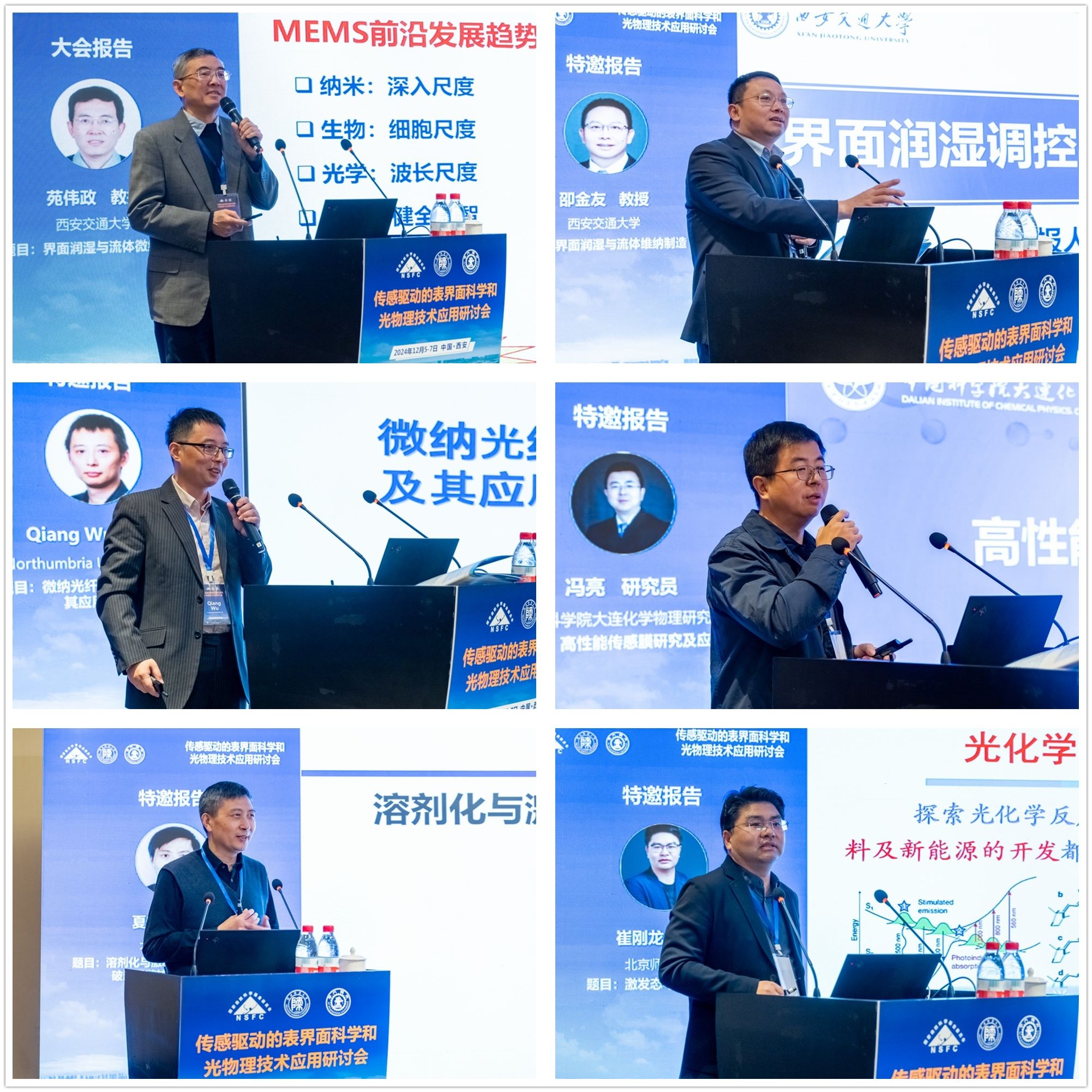 之后的学术报告从不同视角、不同领域涵盖了表界面化学基础与应用发展概括以及取得的重要研究进展,内容丰富,讨论热烈,包括华东理工大学田禾院士的“动态化学之大道至简”、西北工业大学苑伟政教授的“仿生微纳结构及其应用”、西安交通大学邵金友教授的“界面润湿与流体微纳制造”、英国Northumbria大学Qiang Wu副教授的“微纳光纤干涉仪传感器及其应用研究”、中国科学院大连化学物理研究所冯亮研究员的“高性能传感膜研究及应用”、西北工业大学徐亚东教授的“核辐射探测用体块单晶生长与器件制备的表界面问题思考”、北京邮电大学夏安东教授的“溶剂化与激发态构象诱导的对称性破缺电荷转移动力学研究”、北京师范大学崔刚龙教授的“激发态与非绝热过程”、电子科技大学邓旭教授的“表面电荷对固-液界面相互作用的影响机制”、中国科学院福建物质结构研究所徐刚研究员的“内表面敏感型微孔气敏传感材料”、浙江大学彭笑刚教授的“强限域与弱限域半导体纳米晶:光子(激子)操控”、吉林大学汪大洋教授的“表面浸润性的分子尺度建模分析与预测”及中国科学院化学研究所刘鸣华研究员的“多尺度智能软物质体系的构建”。