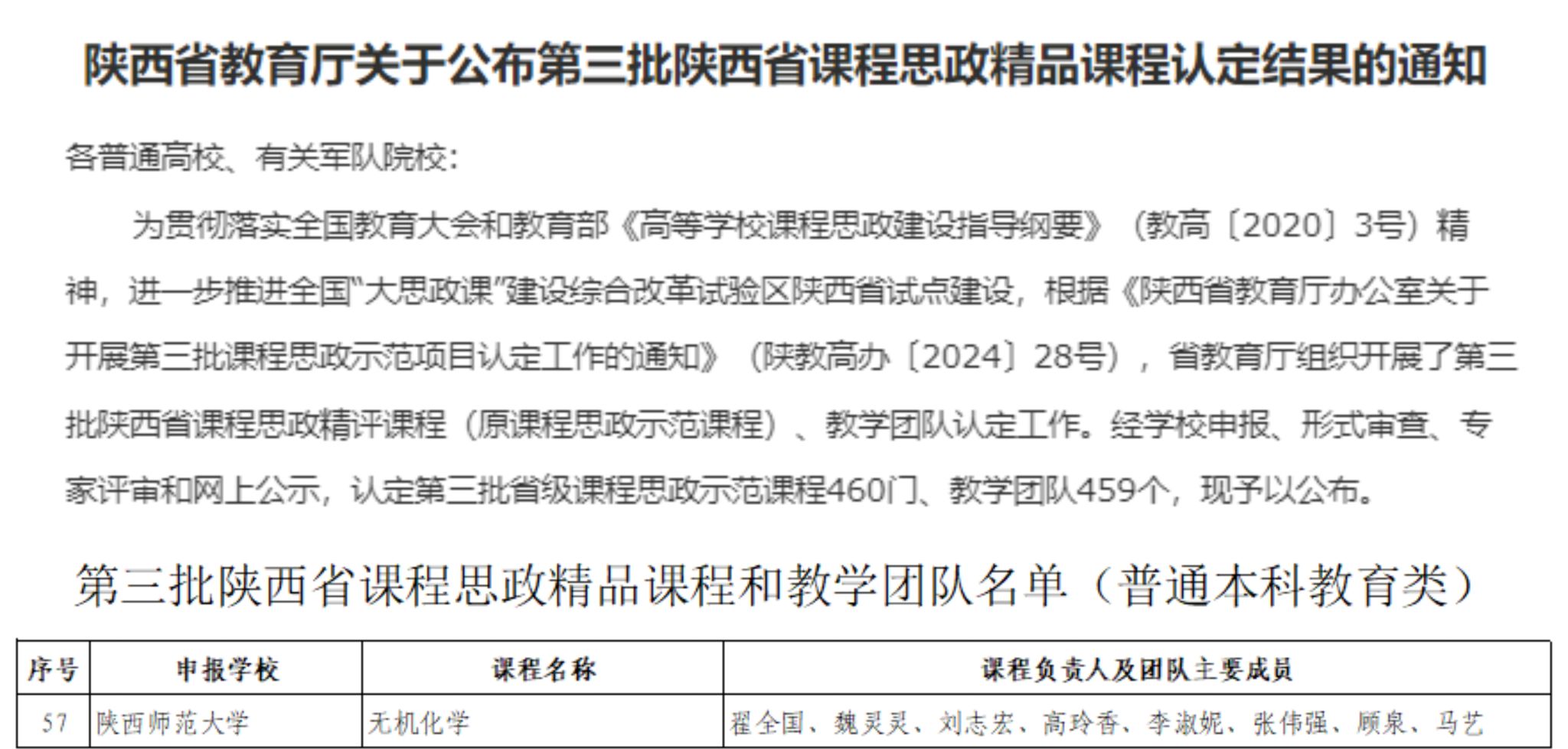 近日,陕西省教育厅发布了《陕西省教育厅关于公布第三批陕西省课程思政精品课程认定结果的通知》,英国365集团公司翟全国教授主持的《无机化学》课程成功入选,该课程教学团队同时被认定为陕西省课程思政教学团队。