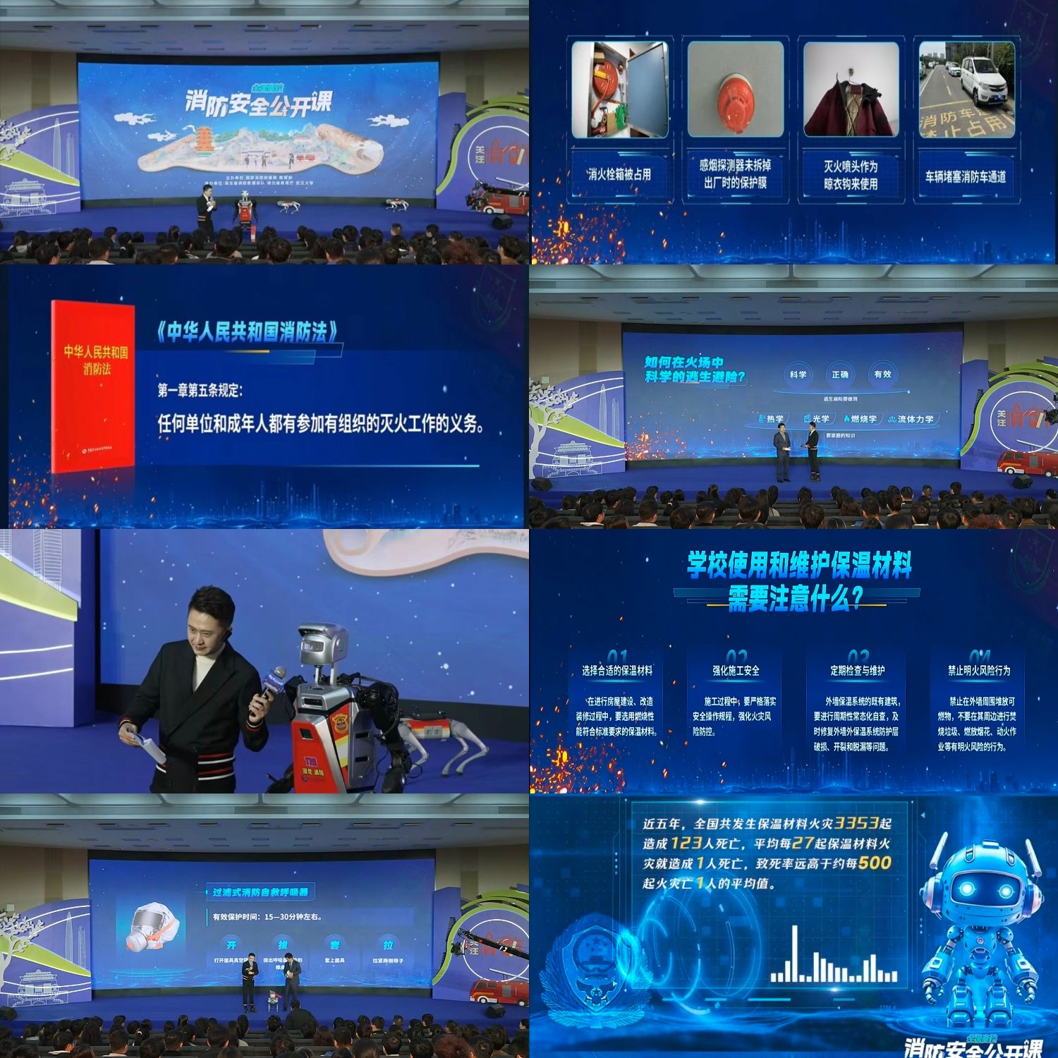 本次公开课以“全民消防,生命至上”为主题,邀请中国消防救援学院杨玲副教授、武汉大学张超教授、湖北省消防救援总队胡荣军工程师担任授课老师,采取课堂教学、模拟实验、案例分析、实操实练等形式,重点讲授了高校易发生火灾场所火灾风险防范、火场疏散逃生方法、常用灭火设施使用和初起火灾处置方法等消防安全知识。