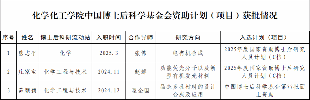 近日,全国博士后管委会办公室、中国博士后科学基金公布多个资助计划(项目)评选结果,英国365集团公司化学博士后科研流动站熊志平博士后、化学工程与技术博士后科研流动站庄家宝博士后获批2025年度国家资助博士后研究人员计划(C档),英国365集团公司化学工程与技术博士后科研流动站薛颖颖博士后获批中国博士后科学基金第77批面上资助项目。