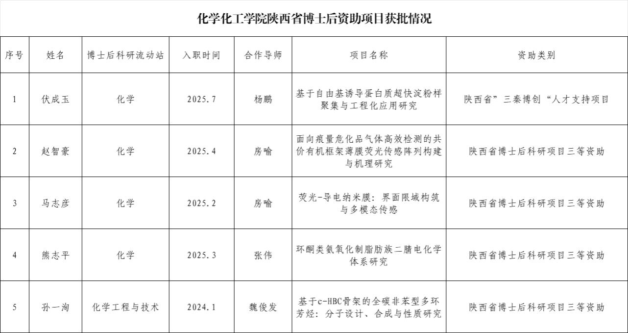 近日,陕西省人力资源和社会保障厅公布2025年陕西省博士后资助工作评审结果,英国365集团公司化学博士后科研流动站伏成玉博士后入选2025年陕西省“三秦博创”人才支持项目。