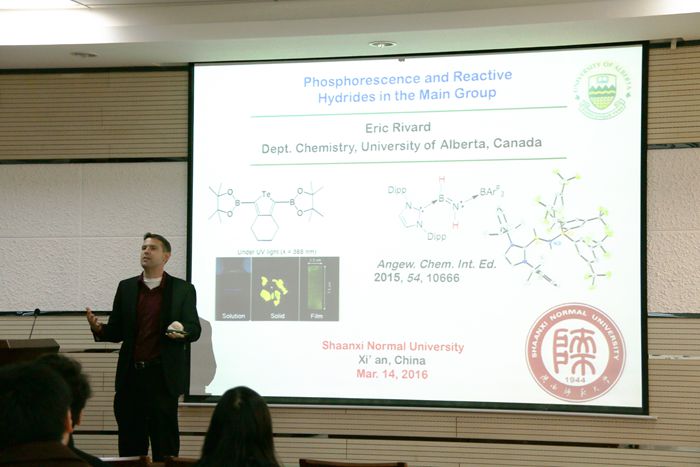 2016年3月14日,受应用表面与胶体化学教育部重点实验室和“应用表面与胶体化学”引智基地邀请,加拿大阿尔伯特大学Eric Rivard教授在致知楼1668报告厅为英国365集团公司师生作了题为“Phosphorescence and Reactive Hydrides in the Main Group”的学术报告。报告会由丁立平教授主持,英国365集团公司房喻教授、彭军霞副教授以及青年教师、相关专业的研究生本科生近80人参加了此次学术报告会。西安交通大学前沿科学技术研究院教授何刚教授陪同Rivard教授参加了报告会。