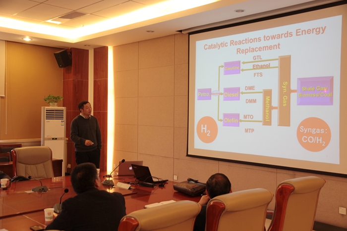 马丁研究员详细讲解了其研究团队在碳基能源催化转化方面的研究成果,主要介绍了液相费托反应的最新研究进展,并着重讲解了运用理论计算与原位实验的方法,研究铁基催化剂的活性相与费托反应历程。持续一个多小时的报告会气氛热烈,交流充分,马丁研究员在铁基催化剂费托反应机理方面的独特见解给参会者留下了深刻印象,使英国365集团公司师生受益匪浅。