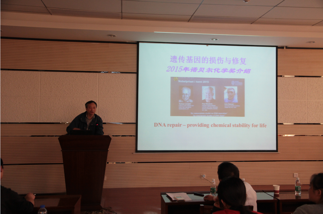曾成鸣教授的报告题目为《遗传基因的损伤与修复——2015年诺贝尔化学奖介绍》。曾教授带领同学们一起学习了遗传基因损伤与修复的背景知识,介绍了本年度三位诺贝尔化学奖得主的研究工作内容和科研经历,使同学们领略了生物化学之美,对化学和生物化学学科有了更多的了解和认识。