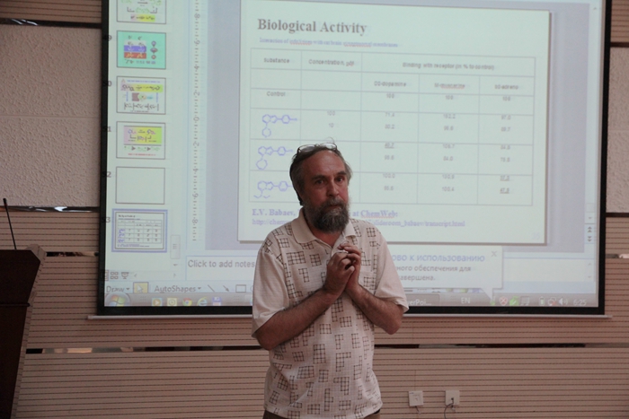 报告中,Eugene Babaev教授用风趣幽默的语言向在场师生介绍了近年来其团队在杂环化合物研究方面取得的进展和成果。详细介绍了杂环化合物的设计,应用及其研究意义。