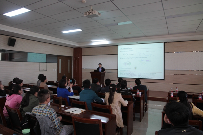 刘学伟老师的研究兴趣主要集中在糖合成、糖蛋白合成和糖生物学等方面。他在糖苷化反应新方法的建立、糖类凝集素信号时别物的研究与开发、糖蛋白及其他天然产物的合成领域做出了突出贡献。刘学伟老师在简单介绍糖类物质研究在抗癌药物合成、生物信号识别和重大疾病防治等方面的重大意义和糖类物质合成所具有的难度和挑战的基础上,着重介绍了其研究小组在利用钯催化和新型邻基参与基团高效建立立体专一的糖苷键的新方法、基于糖合成基础上的天然产物的合成工作和运用新型糖类凝集素生物传感物质的进行信号识别过程。