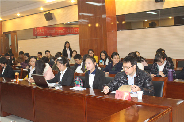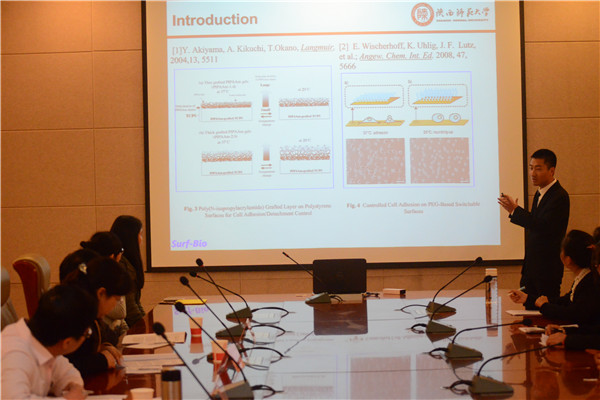 在项目汇报过程中,各个参赛选手逐一为大家分享了他们的科研过程与收获,陶琦同学讲解的《图案化聚合物刷对巨型囊泡的可逆控制》运用特殊的化学动画效果,形象生动地讲解了在低温与高温条件下聚合物刷对囊泡的控制效果,获得了评委们的肯定,同时杨鹏老师也给他提出了ppt制作以及语言表达上的可改进之处;曽欣同学用流利英文讲解的报告表现出了极高的学术水平与英语口语表达能力,得到了评委老师们的一致好评,团队在与评委老师交流过程中,全英文的问答形式也将此次交流会提升到了一个全新的高度。贺兴彤同学汇报的《以四乙烯五胺为模板剂合成分子筛》通过阐述分子筛的合成路线,详细地描绘了他们的实验思路和已取得的进展,团队其他成员也就分子筛成果的表征等问题与老师展开了深入的探讨,给大家留下了深刻的印象;任晓晨同学讲解的《金属铜络合物不对称催化合成α-芳基氨基酸的研究》对实验思路讲解流畅,表现出严谨的科研态度和良好的科学素养。