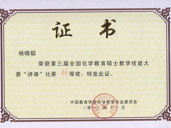 由中国教育学会化学教育专业委员会主办的“第三届全国化学教育硕士教学技能大赛”于2013年11月17日至11月19日在华中师范大学举办。在学院领导的高度重视和支持下,自2013年4月起,科学教育与化学教育学术团队积极组织化学课程与教学论与学科教学·化学研究生进行教学设计,积极准备参赛。经过四个月的积极准备,2013年8月起,共推举出17位同学的教学设计参加初赛。其中杨晓聪、彭涛、赵舒昱、刘晶、杨雪丽、胡婷婷和董腊玲同学的教学设计获得初赛一等奖,进入复赛,黄秋燕、张淑丹、李环宇、高苗、刘丽亚、王婷婷、何颖、刘玲玲、马海燕、代飞10位同学的教学设计荣获二等奖。