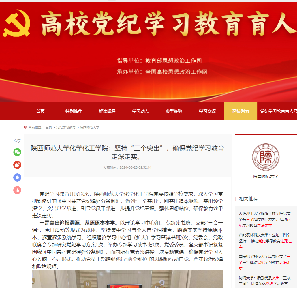 6月28日,《全国高校思想政治工作网》刊发学院党纪学习教育做法:《英国365集团公司:坚持“三个突出”,确保党纪学习教育走深走实。》