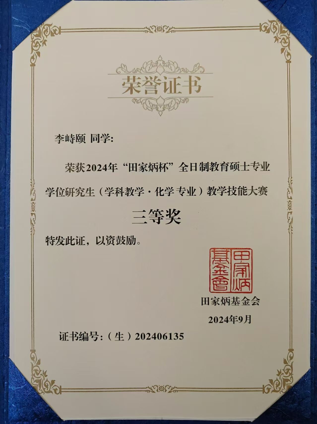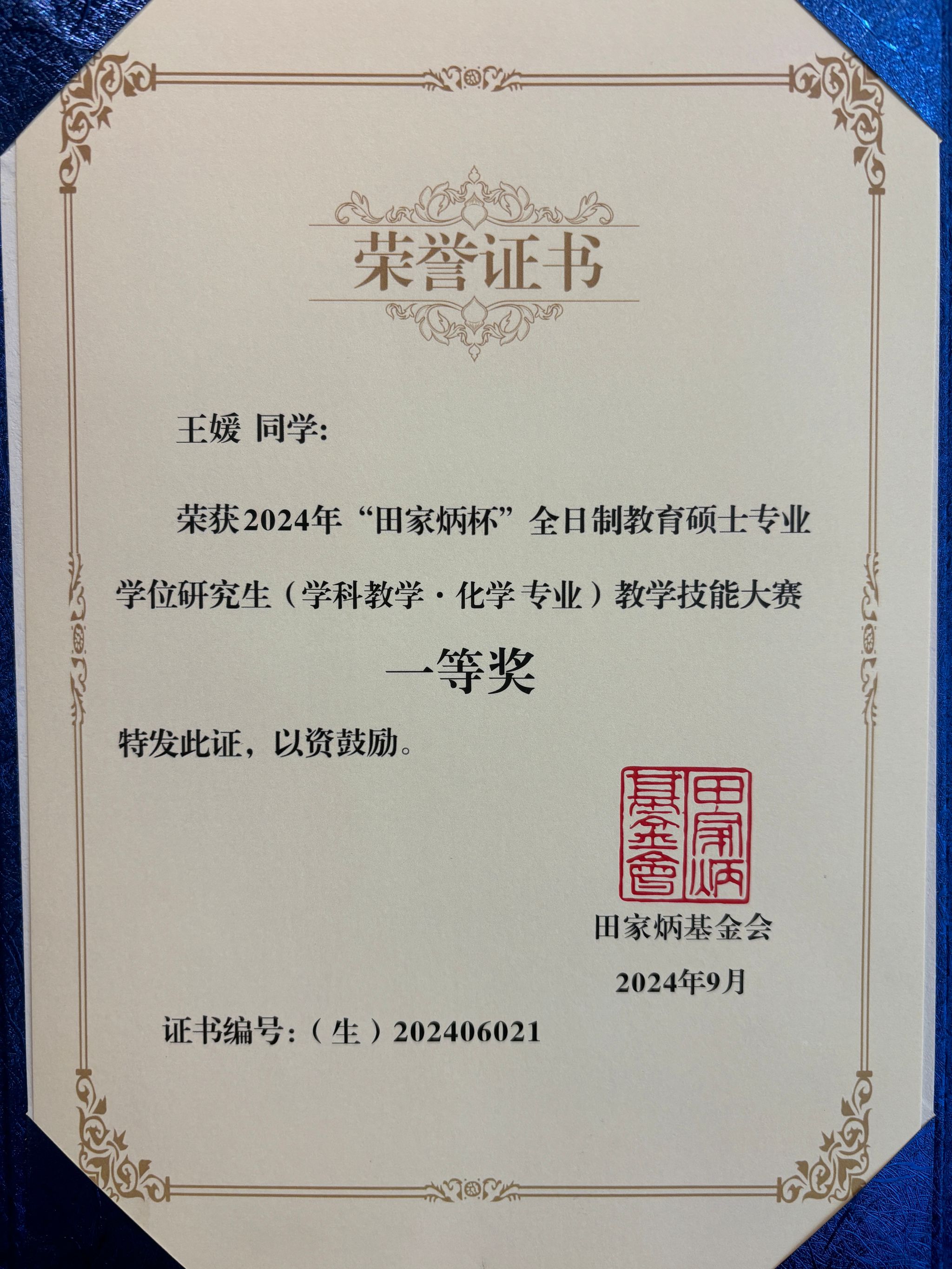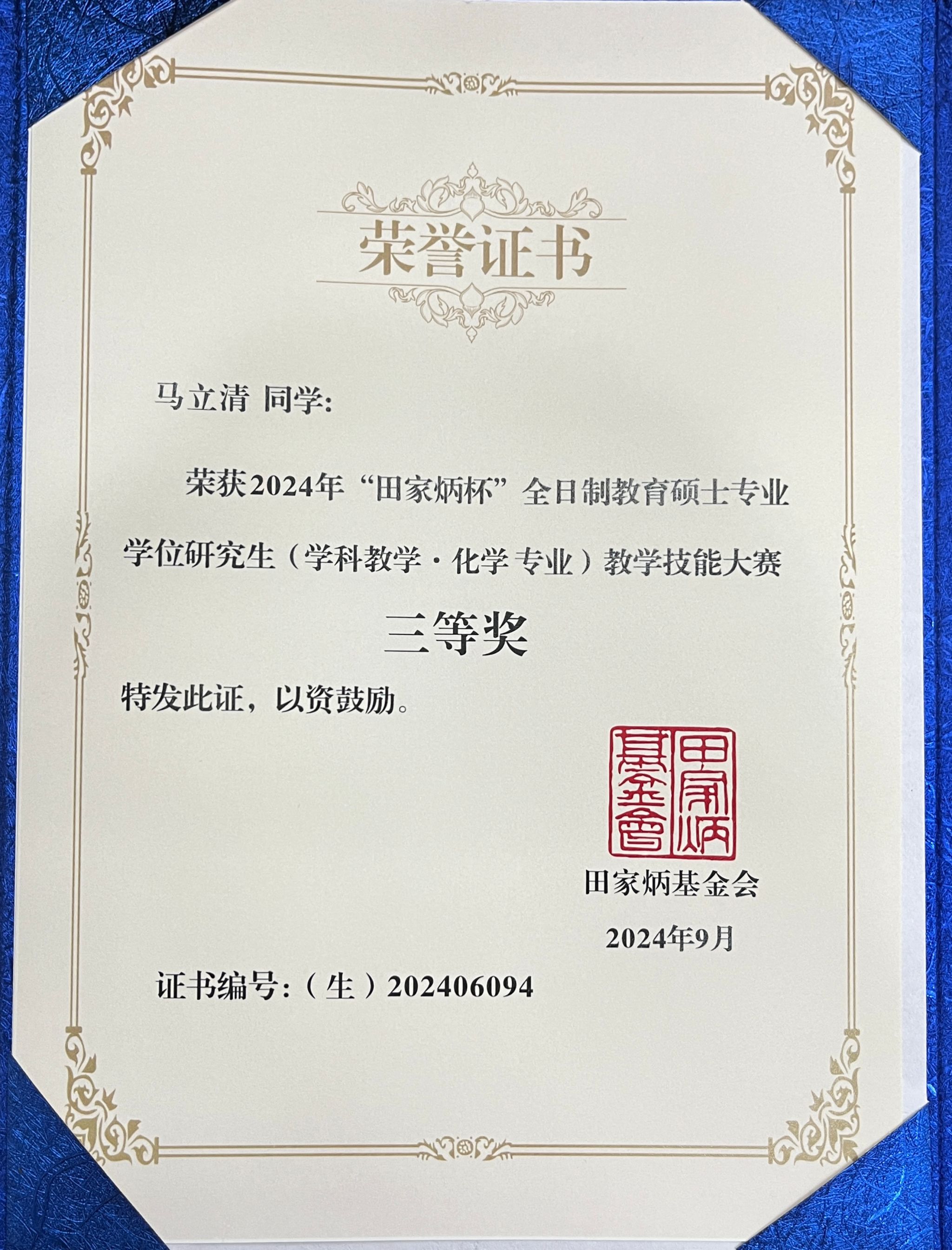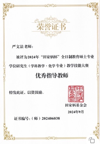 9月7日,2024年“田家炳杯”全国全日制教育硕士专业学位研究生学科教学(化学)教学技能大赛在四川师范大学顺利落下帷幕。经过网络初赛、现场片段教学和即兴演讲展示等环节,英国365集团公司2023级硕士研究生王媛荣获一等奖,马立清、李峙颐荣获三等奖,严文法教授获“优秀指导教师奖”。本次大赛分为初赛和决赛两个环节,共吸引了全国87所高校的优秀学子参赛,共有81所高校的198位选手晋级现场决赛。
