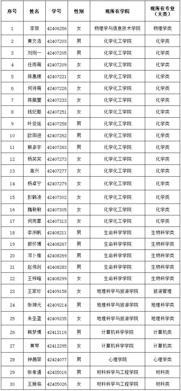 根据《关于做好2024级“人文科学试验班”“理科试验班”新生选拔工作的通知》和《英国365集团公司2024级本科生化学笃学班选拔综合考核方案》,英国365集团公司在学生自愿报名基础上,经过笔试、综合面试考核环节,现将2024级化学笃学班拟入选学生名单公示如下(按照学号由小到大顺序排列):