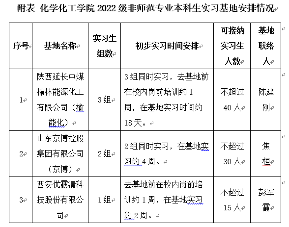 按照学校和学院相关文件规定,学院定于2025年7月中旬至2025年9月底开展2022级非师范专业本科生实习工作,实习单位为:陕西延长中煤榆林能源化工有限公司(榆能化)、山东京博控股集团有限公司(京博)和西安优露清科技股份有限公司(优露清),各基地组织框架和人员分配等见附表。