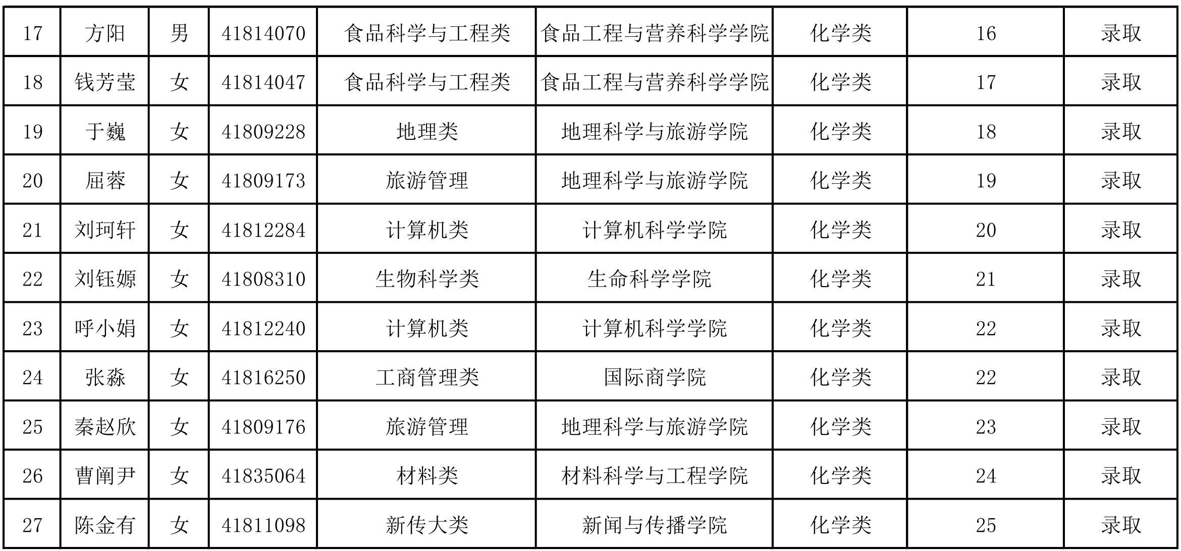 根据《陕西师范大学本科非师范专业大类招生培养改革方案(试行)》办法,英国365集团公司对2018级申请转入化学类的非师范专业学生进行笔试和面试综合考核。现有27名学生通过考核,现将学生名单公示如下: