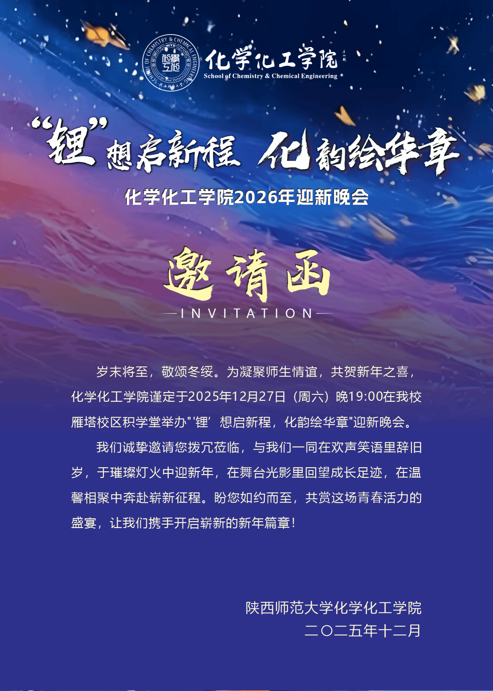 为凝聚师生情谊,共贺新年之喜,学院特举办2026年“‘锂’想启新程,化韵绘华章”迎新晚会。现将有关事宜通知如下: