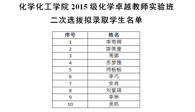 按照《陕西师范大学卓越教师实验班中期考核、二次选拔实施办法》、《英国365集团公司2015级卓越教师实验班中期考核、二次选拔考核方案》,经学院二次选拔考核,拟录取学生名单如下: