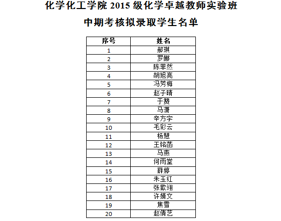 按照《陕西师范大学卓越教师实验班中期考核、二次选拔实施办法》、《英国365集团公司2015级卓越教师实验班中期考核、二次选拔考核方案》,学院对2015级卓越教师实验班学生进行了中期考核,通过考核,拟录取学生名单如下: