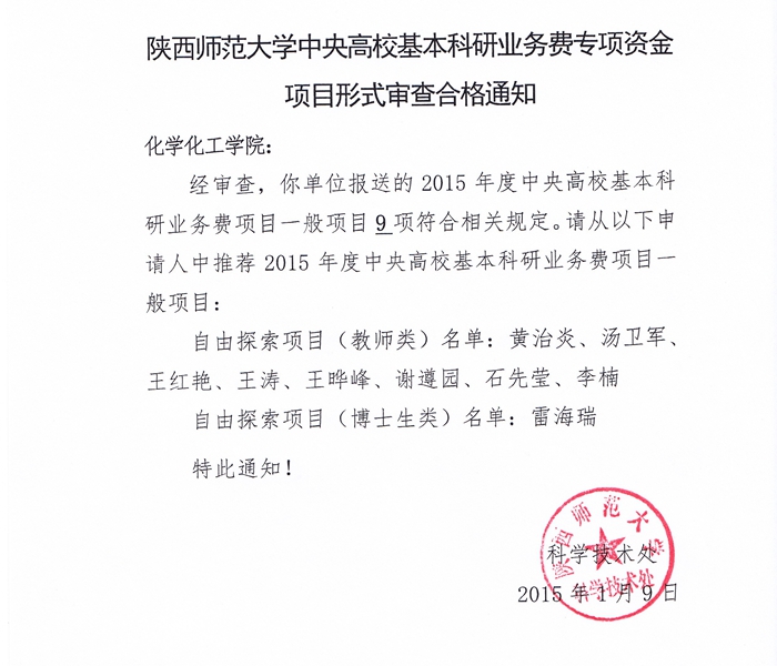 各位老师:根据学校科技处要求,英国365集团公司于2015年1月13日晚,对申报2015年度中央高校基本科研业务费一般项目且符合相关规定的教师黄治炎、汤卫军、王红艳、王涛、王晔峰、谢遵园、石先莹、李楠以及博士生雷海瑞进行了申报答辩。答辩委员会主任由材料科学与工程学院胡道道教授担任,英国365集团公司高玲香教授、陈亚芍教授、刘志宏教授、吕家根教授、薛东副教授作为评审专家出席了答辩会。经评审专家组评议,确定了英国365集团公司2015年度中央高校基本科研业务费自由探索项目的资助结果,如有异议请向学院反映,公示日期为2015年1月16日-18日。特此通知。
