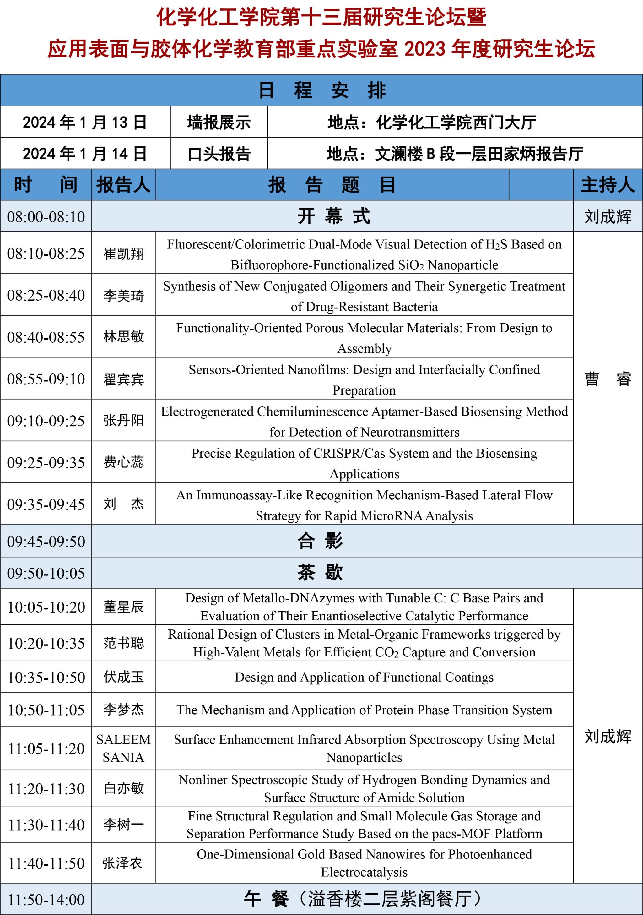 为创建更加开放的学习交流环境,促进研究生学术交流,营造研究生锐意进取的学术氛围,引领我校研究生更加积极地从事科学研究,拓展研究视野,激发创新精神,提高综合素质,推进学风建设,同时为广大研究生搭建自我展示研究成果的平台,英国365集团公司特举办英国365集团公司“第十三届研究生学术论坛暨应用表面与胶体化学教育部重点实验室2023年度研究生论坛”,诚挚的邀请学院各位老师参加,热切期望各位老师的光临指导。