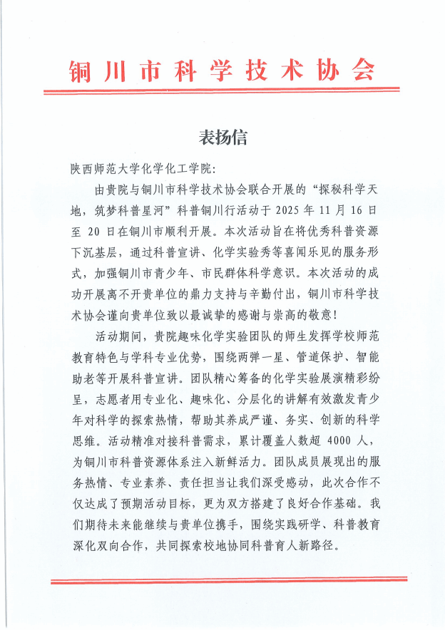此次科普铜川行活动,以实验外展点燃科学热情,以科普宣讲传递时代脉搏,以参观调研深化实践认知,让铜川青少年沉浸式感受科学之美。未来,学院将持续发挥科教资源优势,结合学科和教师教育特色,把科普纳入社会服务职能。推动师生代表、学生组织和科技社团走进基层、服务社会,在科普实践中培育更多兼具专业能力与社会担当的时代新人。