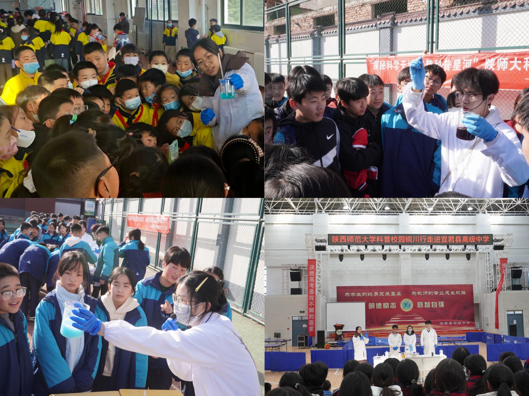 在高新实验学校体育馆、耀州区寺沟初级中学操场、宜君县高级中学体育馆内,化学实验秀通过集中展示、摊位互动、上台体验的方式,带来水精灵、火树银花、蓝瓶子等14项趣味实验,让青少年能够近距离接触化学之美,激发中小学生对科学世界的探索兴趣,使其建立物质变化的基本认识。团队成员岳青艳说,“同学们对实验都非常感兴趣,个个争先恐后,还没讲原理就迫不及待地开始问问题。”在培养科学思维、传播科学思想的同时,也展现出大学生的专业素养与服务基层的青春担当。