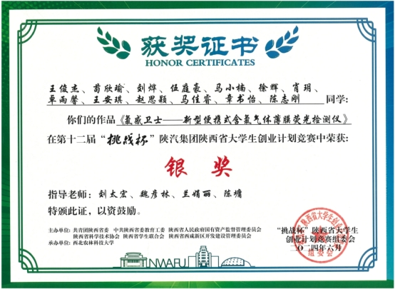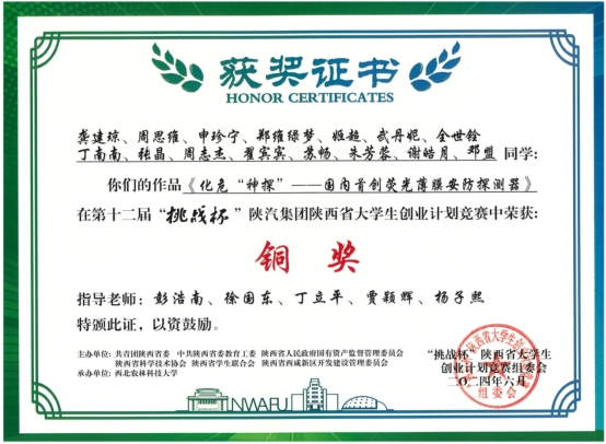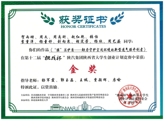 彭军霞教授等指导的项目《“膜”法护盾——助力守护空间环境的新型透气膜开创者》获省赛金奖;刘太宏副教授等指导的项目《氯感卫士——新型便携式含氯气体薄膜荧光检测仪》获省赛银奖;彭浩南教授等指导的项目《化危“神探”——国内首创荧光薄膜安防探测器》获省赛铜奖。