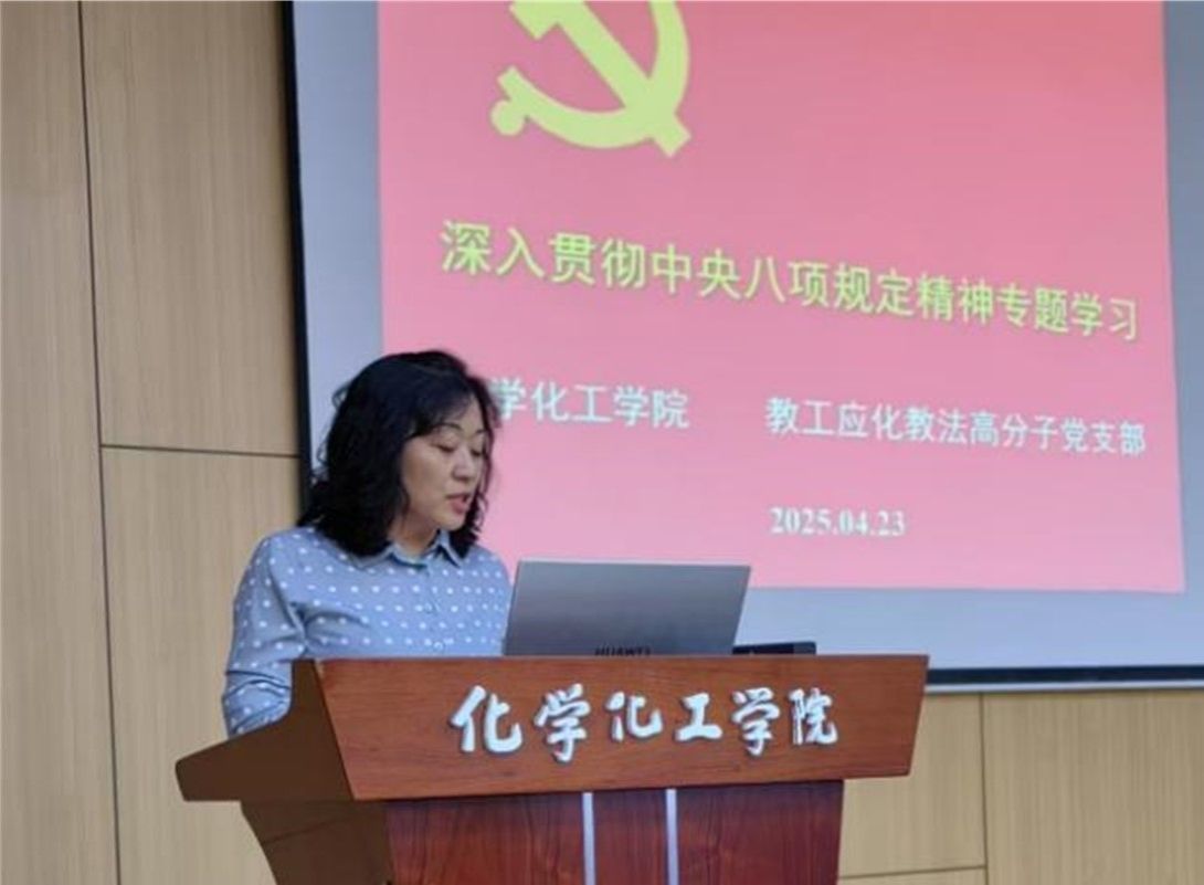 4月23日下午,教工应化教法高分子党支部开展专题理论学习。支部书记陈建刚领学中央八项规定精神及实施细则。学院党委书记高玲香围绕落实中央八项规定精神及强化师德师风建设讲授专题党课,强调贯彻落实中央八项规定精神对于推动作风建设和党风廉政建设的重要作用。她要求支部党员要常怀敬畏之心,自觉严守纪律底线,坚决杜绝形式主义、官僚主义、享乐主义和奢靡之风,切实做到廉洁自律、务实高效。
