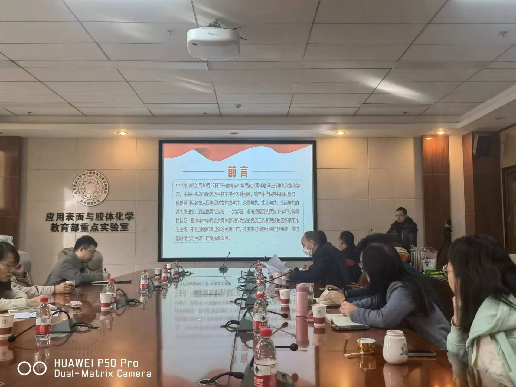 教工物理化学党支部召开“铸牢中华民族共同体意识”专题组织生活会。刘峰毅同志通报了学院关于成立教师工作组的事项。赵健同志带领大家深入学习贯彻习近平总书记的重要讲话。杨鹏同志分享了自己在成果转化方面的一些经验和感悟。房喻院士对杨鹏同志在基础研究和应用研究方面取得的成绩给予了充分肯定,并鼓励大家要特色化、差异化发展。