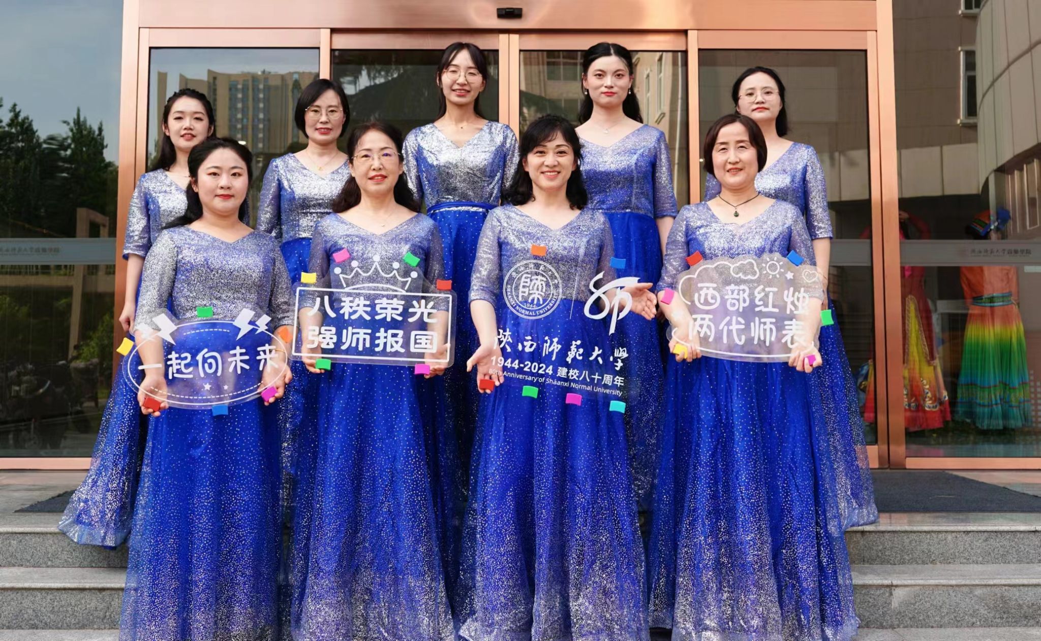 为庆祝陕西师范大学80周年校庆,校工会筹办了“八秩荣光 强师报国”80周年校庆教职工年代歌曲情景合唱展演活动,我校16个学院和机关单位参加了展演活动。学院党委书记高玲香和学院教师陈亚芍、刘伟、金燕、马佳妮、王红艳、马艺、彭灵雅、刘慧敏、袁书培、王艳艳等11位教师一起演唱了歌曲《我们的生活充满阳光》。