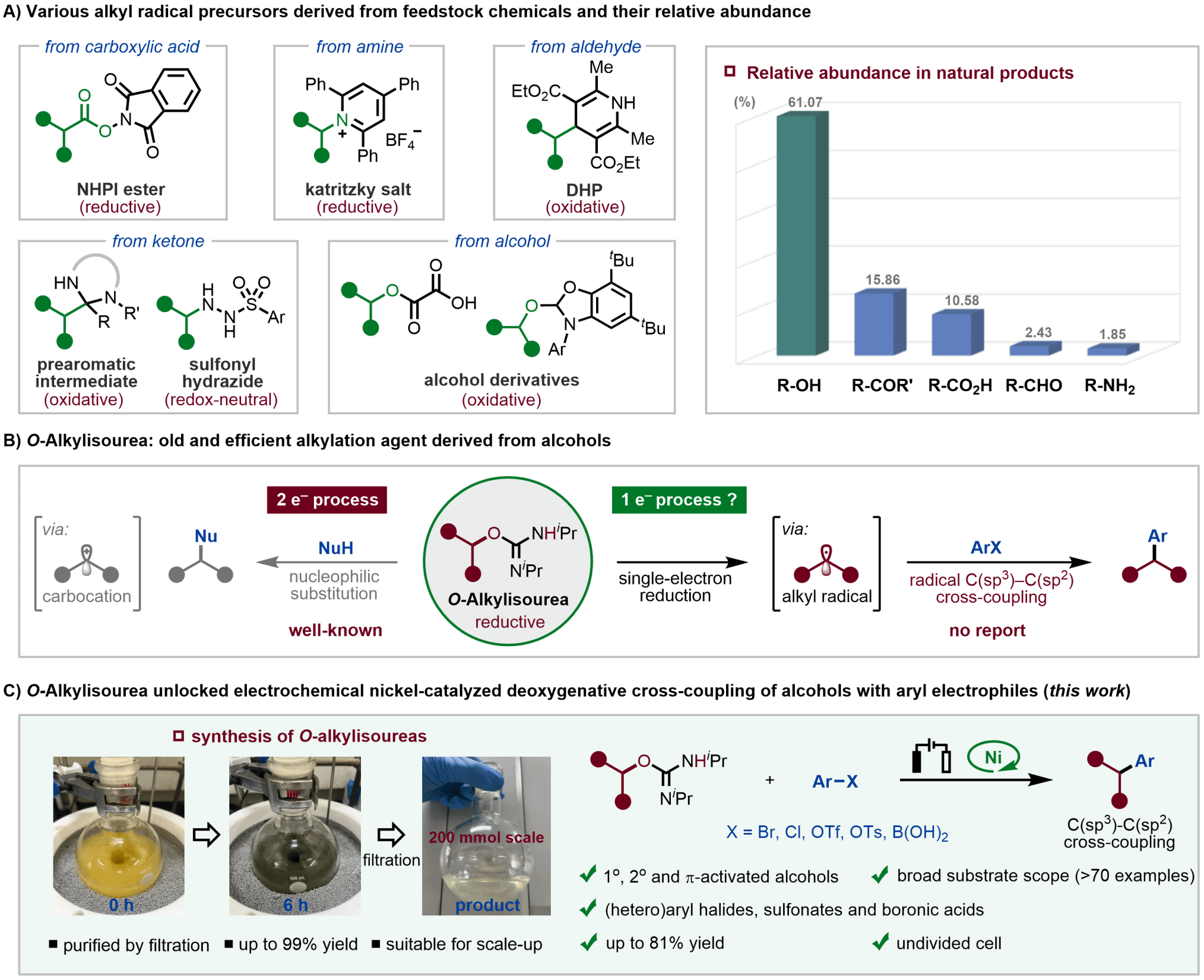 该工作首次实现了氧-烷基异脲的电化学还原活化,将醇衍生物转化为稳定且可调控的C(sp³)自由基前体;通过镍催化与电化学的协同,构建了兼具绿色性、普适性及实用性的C(sp³)-C(sp²)交叉偶联体系。该方案不仅拓展了醇衍生物的转化路径,也为自由基参与的过渡金属催化反应提供了新的设计思路。