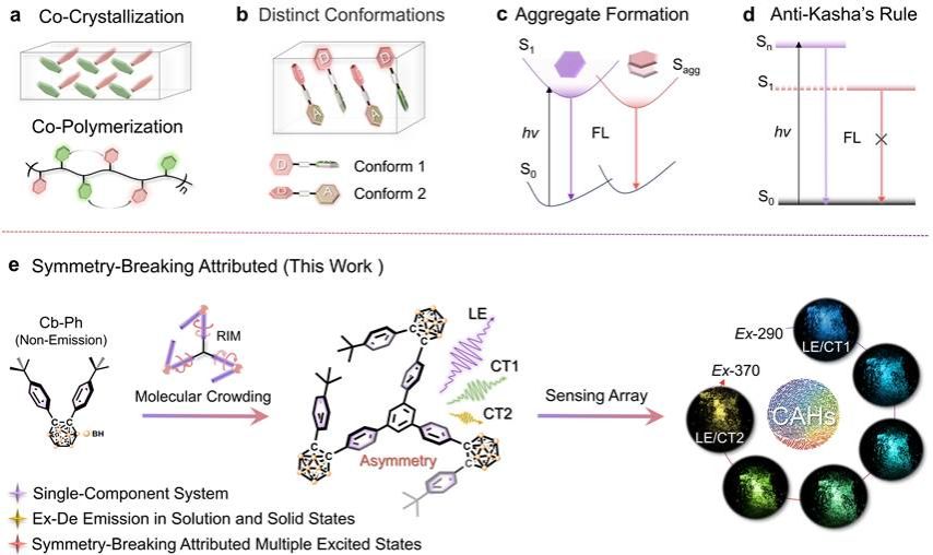 有机荧光材料(OFMs)多为“固定发射”,在多功能场景中的适配性受限。相较之下,激发依赖型(Ex-de)材料可随激发波长动态、可逆地呈现多色发光,在防伪、加密/解密、传感等方面潜力巨大。然而,现有实现路径多依赖多发光体的共结晶/共聚或固态聚集构筑,易引入色彩老化、相分离与稳定性下降,且常需晶体堆积才能稳定多构象,难以兼顾溶液、非晶与晶态“三态”普适性。为此,亟需一种在“单分子、跨形态”层面调控激发态弛豫通道的普适策略。