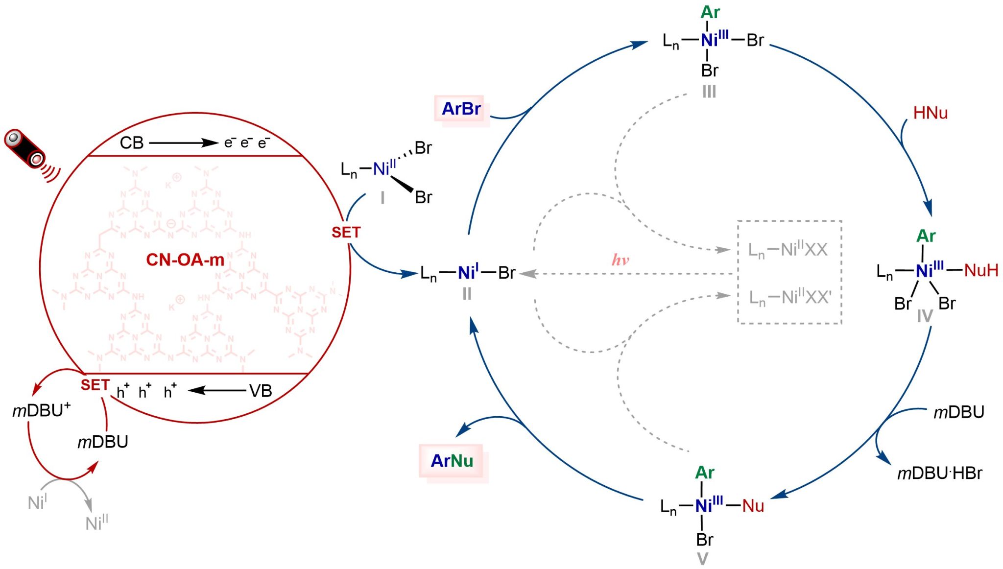 为了理解反应过程,作者通过EPR实验证实了非均相CN-OA-m吸收红光后触发的电荷分离过程,产生电子-空穴对。这些电子从导带转移到Ni(II),通过单电子转移将其还原为Ni(I)物种。同时,有机碱(mDBU)的电子转移到空穴中,完成光催化循环。Ni(I)物种随后与芳基卤化物发生氧化加成反应,形成Ni(III)复合物,该复合物与亲核试剂发生配体交换。生成的物种被有机碱去质子化,形成Ar-Ni(III)-Nu物种,随后发生还原消除反应,释放ArNu偶联产物,并生成Ni(I)物种以启动下一个催化循环。当停止光照时,通过Ni(III)和Ni(I)物种的共还原或有机碱自由基阳离子对Ni(I)的再氧化,形成催化惰性的Ni(II)物种,从而中断反应。持续的光照对于将这些非活性的Ni(II)物种重新转化为活性的Ni(I)物种至关重要,以维持催化循环 (图7)。