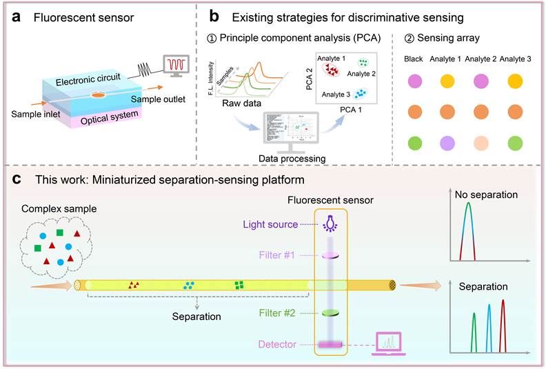 1. a) 荧光传感器; b) 现有的区分传感策略; c) 微型化的分离传感平台。