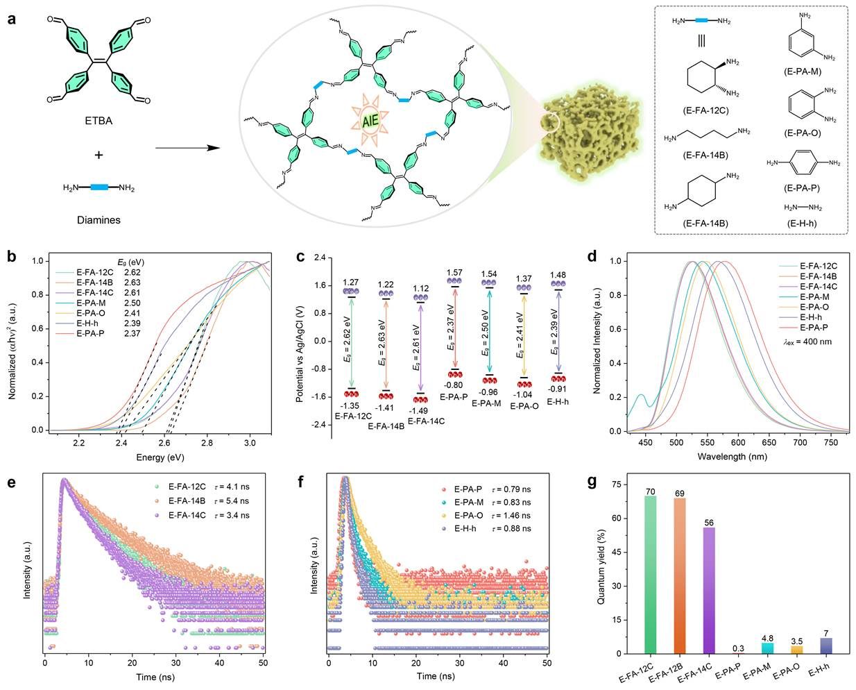 2. 荧光整体材料的合成和光物理性质。a) 化学结构; b) Tauc曲线; c) 价带和导带分布图; d) 荧光发射光谱; e-f) 荧光寿命; g) 量子产率。