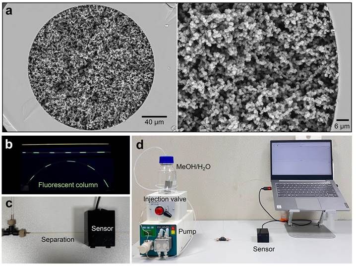 3. E-FA-12C荧光柱的a) 扫描电镜图像; b) 日光和紫外光下荧光整体柱的照片; c) 具有分离和传感能力的整体柱; d) 自制的分离传感平台。