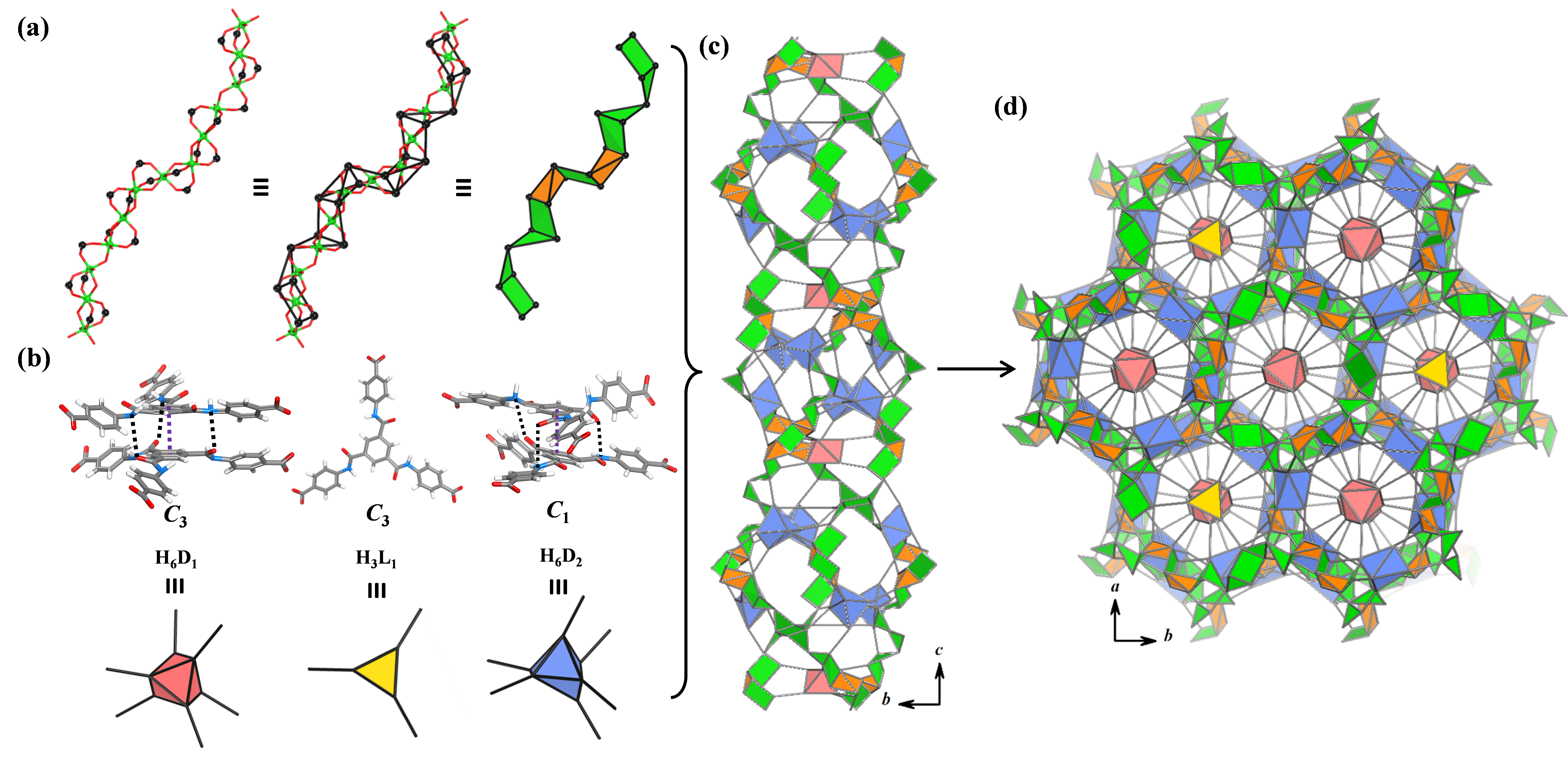近二十年来,网格化学在金属有机骨架材料化学的发展过程中扮演着极其重要的角色。值得注意的是,所报道的MOF网格化学主要集中于金属簇基的金属有机骨架材料化合物。相比之下,基于金属链基的MOF网格化学则发展较为缓慢。根据该类化合物中链基次级结构单元的朝向的不同,可以将其划分为一维、二维及三维链基金属有机骨架材料。所报道的化合物中主要以一维链基MOF材料为主,往往含有简单的一维通道结构。尽管二维链基MOF化合物也有所报道,仍为数不多。而三维链基MOF结构则仅有一例,足见该类链接MOF合成的难度。这也与Yaghi等人的结构预测一致,即该类化合物中无机链的平移单元的长度应与二齿配体长度保持相等。由于该三维链基MOF是在材料酸碱稳定性检验的过程中产生的,且没有永久多孔性,因而长期以来并没有收到人们的关注。但是,该结构是由立方堆积的三维链与三齿有机配体沿着四个三次轴相互连接形成,给了我们极大的启发:三齿配体而非双齿配体是合成三维链基MOF的有效策略。基于以上研究,我们分别利用单一的酰胺功能化的三羧酸配体和三羧酸与二羧酸混合配体策略,选用铟离子作为金属源,成功构筑了一系列三维链基MOF化合物。单晶结构分析表明:系列结构中都含有三维链基分子结构基元,与报道的三维链接MOF结构不同的是,这些三维链基分子结构基元呈现三方堆积模式;结构中的三齿三羧酸配体通过非共价键作用形成二聚结构,扮演着新型的六羧酸的功能;该系列结构中均含有笼状而非通道结构。而且,尽管该系列化合物均具有三方晶系的高对称性空间群,其拓扑分析的传递性仍分别高达18 42 和18 44,充分表明该类化合物的稀有性和合成的高难度。值得一提的是,该系列化合物均具有较高的比表面积和孔体积。高压吸附性能测试表明,它们也具有良好的甲烷存储性能,其体积工作能力远远高于众所周知的链基Ni-MOF-74。总之,该工作不但合成了同网络的三维链基MOF,而且实现了真正意义上的三维链接MOF的网格化学,为合成具有高维的新颖链基MOF材料提供了新的思路。