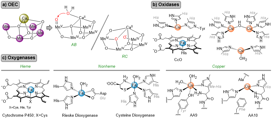 析氧反应和氧还原是自然界生物质能转化的基本过程,同时也是一种当前社会利用化石燃料进行能量转换的重要途径。在自然界中,催化水或者氧气进行析氧或者氧还原的生物酶活性中心含有过渡金属,例如锰、铁和铜。这些过渡金属–氧、–超氧和–过氧物种是O–O成/断键过程常见的反应中间体,其种类与稳定性对反应效率与机理选择影响很大。但是,潜在的高价态金属–氧物种由于其高的反应活性,存在时间往往很短,很难对其进行分离与表征。自然界酶催化O–O成/断键机理迄今依然存在争议,比如引发O–O成/断键的关键中间体的具体种类,以及O–O成/断键的反应机理及其影响因素等。生物酶催化反应机理的不确定性可以通过研究人工模拟酶-过渡金属配合物的催化过程来进行推测与反演。