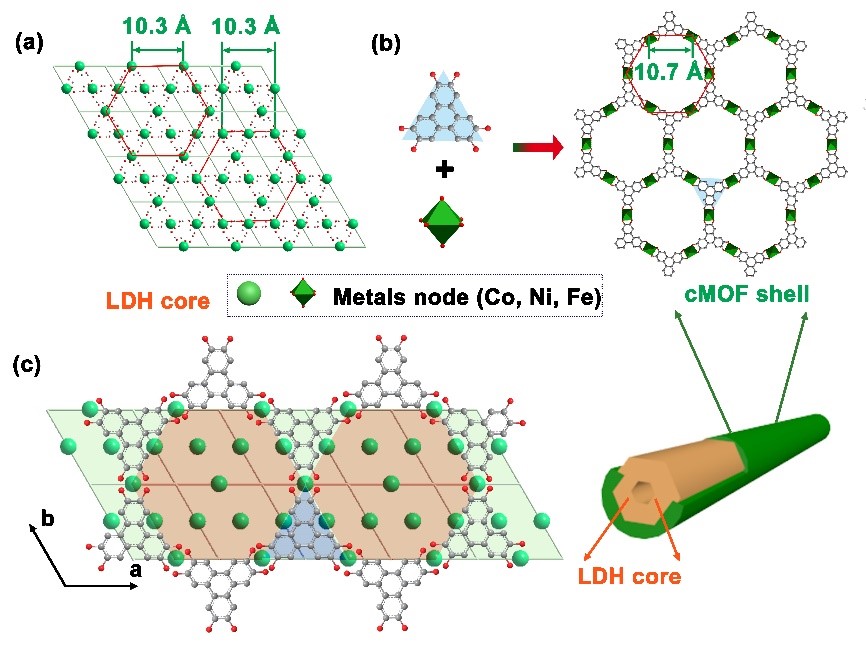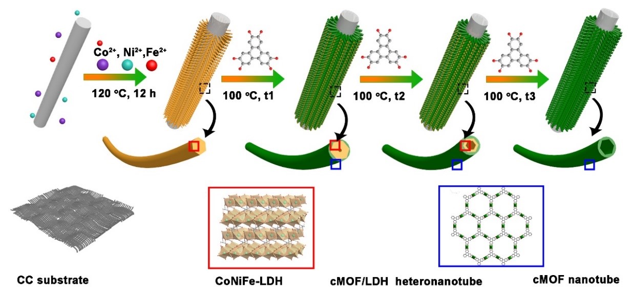 针对这一问题,溶液化学与功能材料研究团队翟全国教授课题组提出了一种有前途的自下而上的晶格匹配合成策略,用于构建高度可控的、多级孔结构的导电MOF/氢氧化物(cMOF/LDH)异质纳米管阵列电极,展现出超高效的析氧反应(OER)活性。