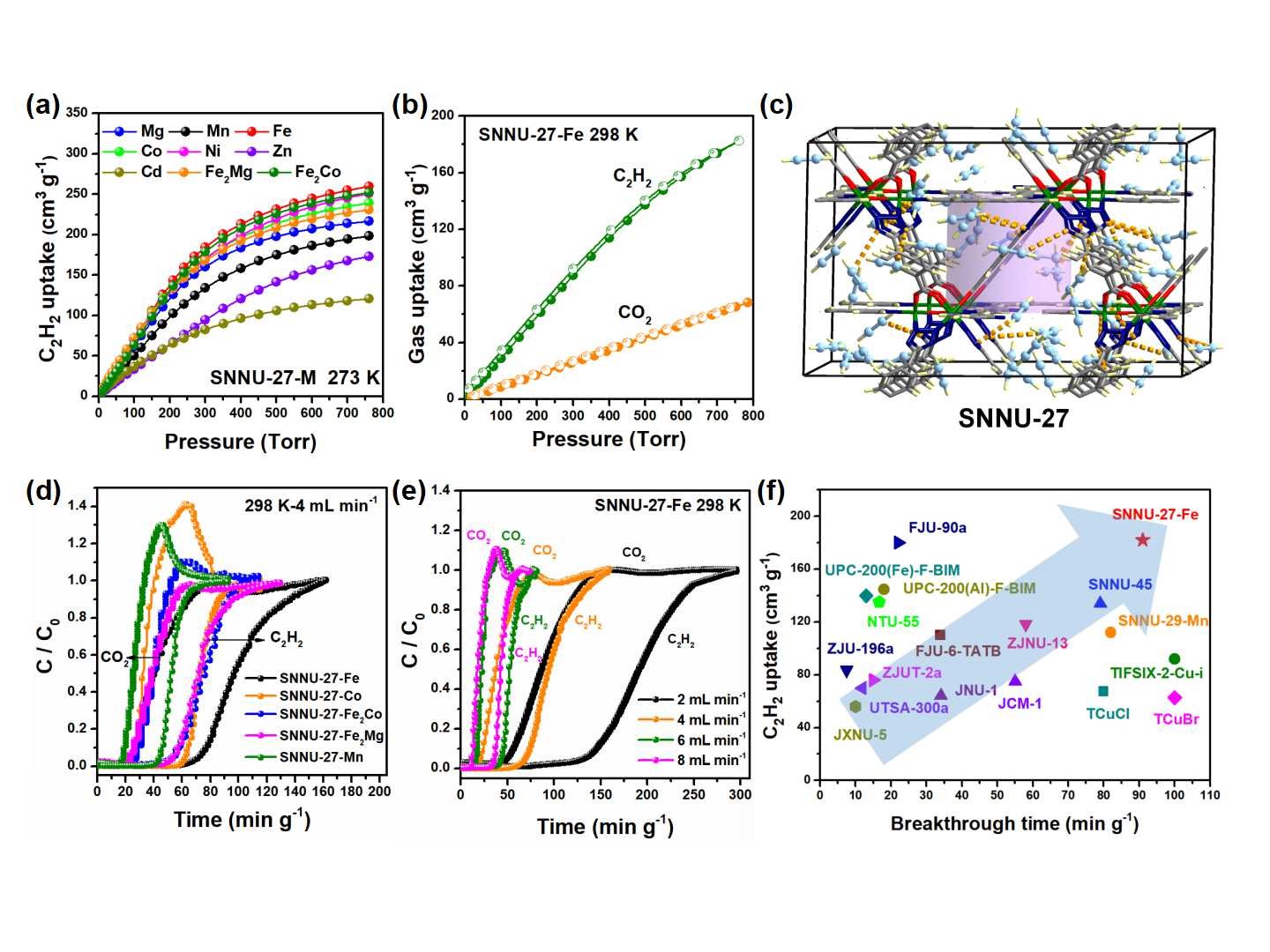 基于此,作者以具有一维通道的经典MOF材料MIL-88为母体框架,在此基础上引入对称性匹配的C3配体作为孔道分区体,精准设计合成了孔尺寸分别为4.5 Å(SNNU-26),6.4 Å(SNNU-27),7.1 Å(SNNU-28)和8.1 Å(SNNU-29)的四类MOF材料。其中,SNNU-27和SNNU-29材料的母体框架为含有四氮唑的线性配体,四氮唑上未配位的氮原子裸露于孔道表面,其作为高密度的氢键受体可增强MOF框架与乙炔分子之间的作用力。合适的孔尺寸结合孔道中高密度的氢键受体使SNNU-27展现出高的乙炔吸附分离能力。尤其是SNNU-27-Fe材料, 在常温常压下对乙炔的吸附容量可达到182.4 cm3g-1,同时乙炔/二氧化碳的穿透分离时间可达91 min g-1,该结果高于目前报道的绝大多数吸附剂材料。GCMC理论模拟结果进一步证明了合适的孔尺寸和高密度裸露氮位点的协同效应有效提升了MOF材料对乙炔分子的吸附容量和选择性。