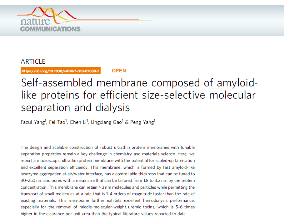 Facui Yang, Fei Tao, Chen Li, Lingxiang Gao, Peng Yang*, Self-assembled membrane composed of amyloid-like proteins for efficient size-selective molecular separation and dialysis. Nat. Commun. 2018, DOI: 10.1038/s41467-018-07888-2