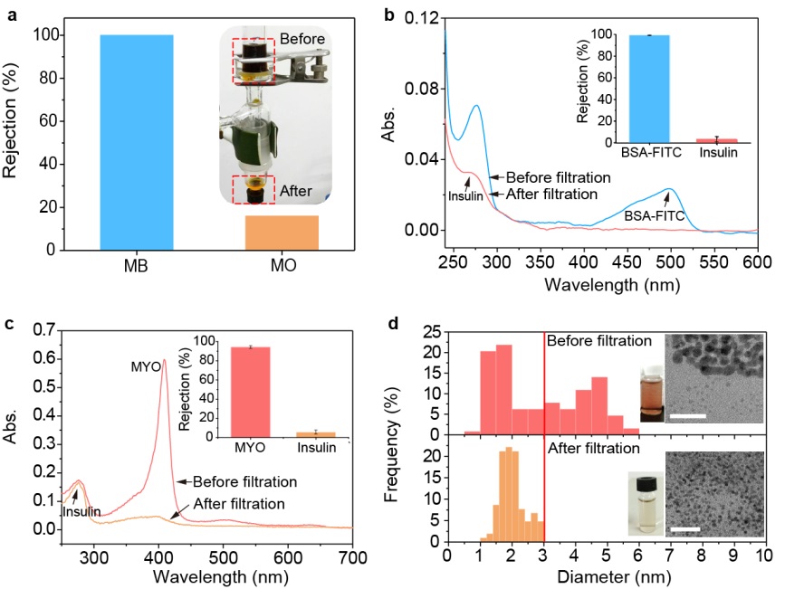 另外,该膜可用作超滤膜,从而在压力驱动下(例如100 kPa)快速分离不同大小的染料、蛋白质以及纳米颗粒(图5)。
