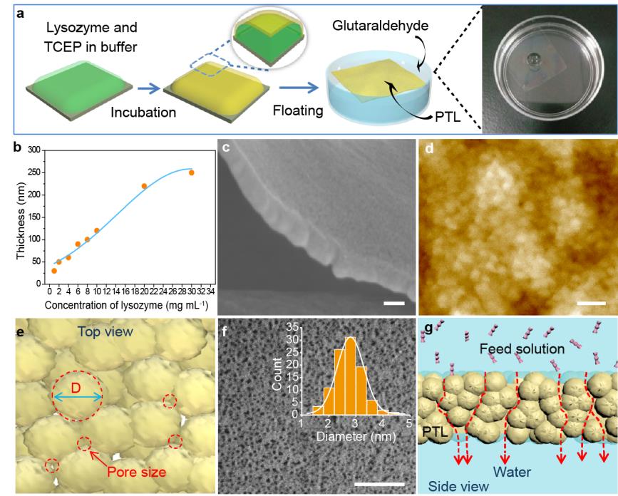 生物大分子如多肽和蛋白质以β-sheet折叠结构为核心而形成的淀粉样积聚体(amyloid)是存在于自然界的一类重要的生物高分子组装结构。在国家自然科学基金委等项目的支持下,陕西师范大学杨鹏课题组先前曾报导过由二硫键还原剂Tris(2-carboxyethyl)phosphine (TCEP)快速打开溶菌酶分子内的二硫键而解锁α-螺旋结构,诱导其向更加低能量的β-sheet自发转变而组装成的相转变溶菌酶(phase-transited lysozyme,PTL)纳米薄膜,聚集条件温和可控、速度快、材料和过程成本极大降低(Adv. Mater. 2016, 28, 7414;Biomater. Sci. 2018, 6, 836)。该膜表现出优异的生物相容性、高的界面粘附稳定性、丰富的界面功能基团和组装形态(Adv. Mater. 2016, 28, 579;Angew. Chem. Int. Ed. 2017, 56, 9331;Angew. Chem. Int. Ed. 2017, 56, 13440;Adv. Mater. 2018, 30, 1802851;Adv. Mater. 2018, 1803377;Adv. Funct. Mater. 2017, 28, 1704476; ACS Appl. Mater. Interfaces 2017, 9, 198),从而有望将其应用于分离膜领域。在以上研究基础上,进一步的研究发现将该蛋白质基纳米膜用戊二醛交联后可用作透析和超滤膜分离。该膜是由蛋白质淀粉样转变前期形成的纳米级球状寡聚体在气液界面聚集而成,而不同寡聚体小球相互聚集之间的缝隙为高效分子和胶体分离提供了天然的纳米孔道。膜厚度和孔道直径可通过改变蛋白质的浓度来调控(图1)。