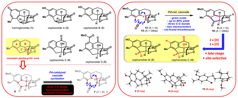 在我国,三尖杉是重要药源植物,其总生物碱对淋巴肉瘤、肺癌等都有较好的疗效。2012年,三尖杉酯碱Homoharringtonine首次通过美国FDA审查并批准上市,用于治疗对酪氨酸激酶抑制剂具有抗拮的慢性或加速期粒细胞白血病。除三尖杉生物碱外,近年来,药物化学家们从三尖杉科植物中分离得到了一大类萜烯类天然产物。截至目前,已有超过25个三尖杉属二萜天然产物被先后分离报道,有限的生物学研究表明部分化合物具有很强的抗癌活性 (Human KB cells, IC50 = 43 nM)。从结构上看,这类天然产物由一个独特的多环笼状碳骨架、多个连续立体化学中心、具有较大张力的内酯桥连单元组合而成。复杂的化学结构使得对这类天然产物的化学合成充满了挑战,特别是如何高效、高选择性构建分子骨架中顺式稠合的三环体系(BCD三环)以及多级氧化态的适时调整,在合成化学上具有很大的挑战性。
