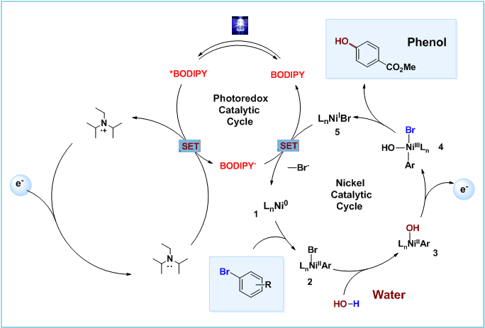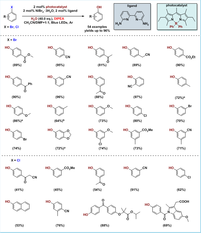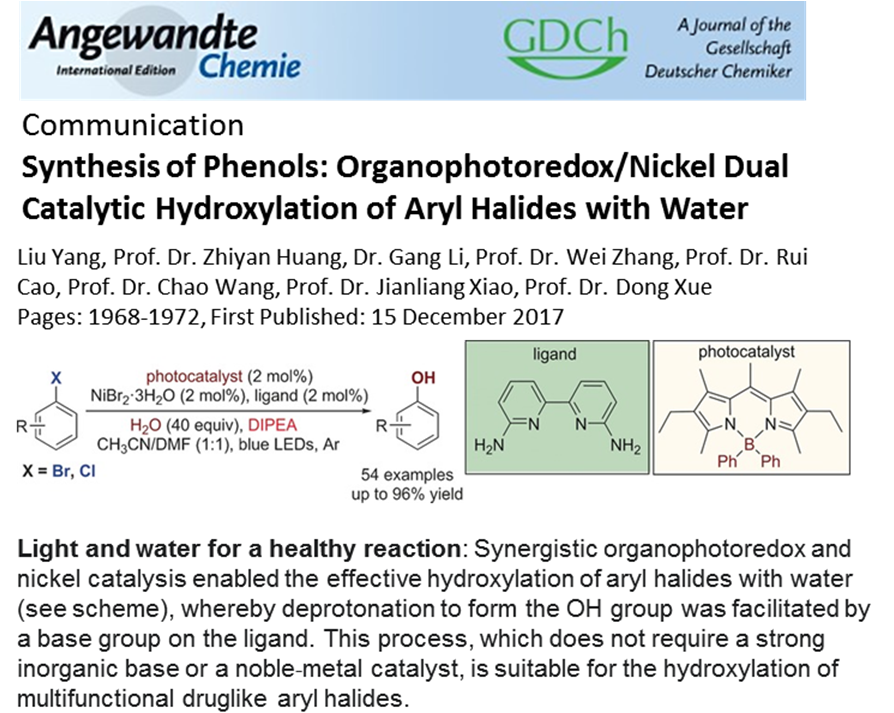 Synthesis of Phenols: Organophotoredox/Ni Dual Catalytic Hydroxylation of Aryl Halides with Water,Liu Yang, Zhiyan Huang, Gang Li, Wei Zhang, Rui Cao, Chao Wang, Jianliang Xiao, and Dong Xue*,Angew. Chem., Int. Ed. 2018, 57, 1968-1972。(全文见https://doi.org/10.1002/anie.201710698)