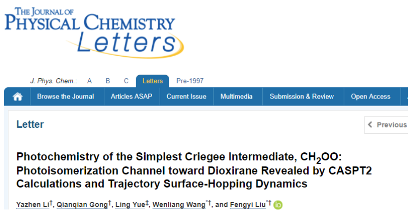 Yazhen Li, Qianqian Gong, Ling Yue, Wenliang Wang*, and Fengyi Liu*, Photochemistry of the Simplest Criegee Intermediate, CH2OO: Photoisomerization Channel toward Dioxirane Revealed by CASPT2 Calculations and Trajectory Surface-Hopping Dynamics, J. Phys. Chem. Lett. 2018, 9 (5), pp 978–981, DOI: 10.1021/acs.jpclett.8b00023