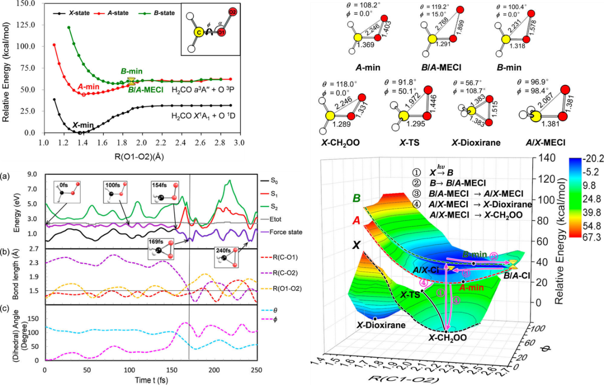 Criegee中间体(CR2OO)是大气中一种重要的活性中间体,它广泛地参与大气中的单分子和双分子反应,生成多种亚稳态物种(如OH, HCHO和1O2等),因而在大气循环和环境污染及控制中具有重要地位。Criegee中间体参与的反应一直以来都是是实验和理论研究的热点之一。由于Criegee中间体存在于大气对流层当中,日间受到充足的阳光照射,这使得其光物理和光化学过程具有十分重要的意义。目前,Criegee中间体的光化学反应(如O-O键或C-O键的断裂)过程已有实验和理论报道。此前理论研究发现,最简单Criegee中间体(CH2OO)在被激发到B1A′态后通过两个自旋禁阻的反应通道(即H2CO X1A1 + O 1D 和 H2CO a3A″+ O 3P)实现O-O键断裂的反应趋势。